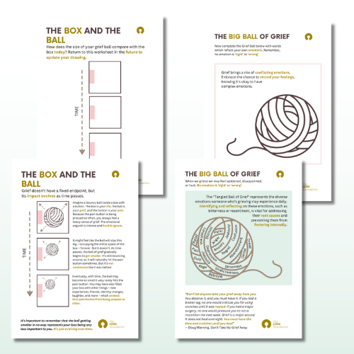- The Ball of Grief – An exercise to reflect on and explore the overwhelming emotions of grief by imagining them as a tangible object.
