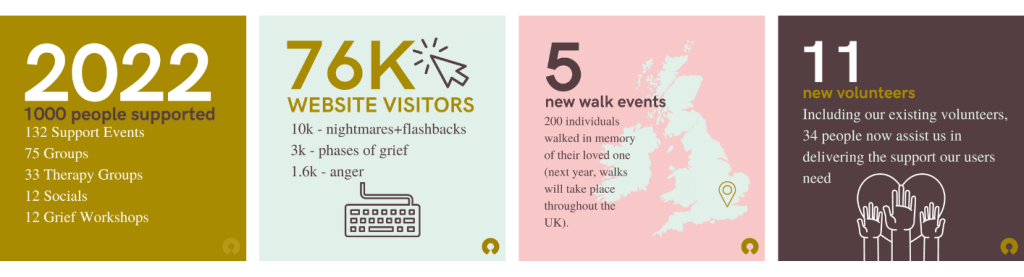 2022 has been a busy year for The Loss Foundation. Just three years ago, we were running two support events per month. Over the course of 2022, we’ve run an average of 11. We hope these events have helped you (and we are still here for you when you need us – please see our calendar of upcoming events if you’re looking for further support).