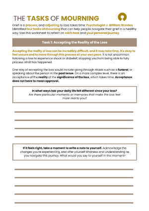 Our Tasks of Mourning worksheet is based on J. William Worden’s four tasks of mourning, which guide individuals through the grieving process. These tasks are designed to support the process of adapting to life after loss.