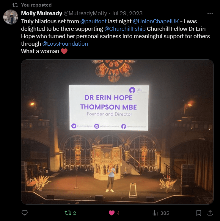 On Friday 19th July 2024, Stand Up for The Loss Foundation returns to the Union Chapel, London, for the ninth year running! Here’s what a few people said last year…